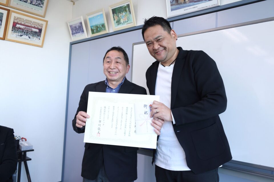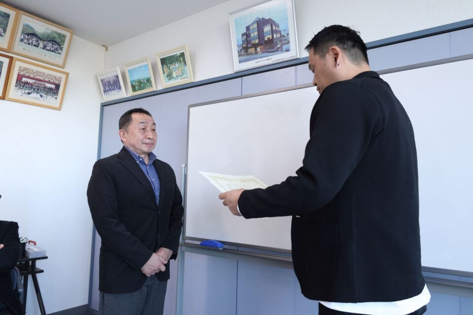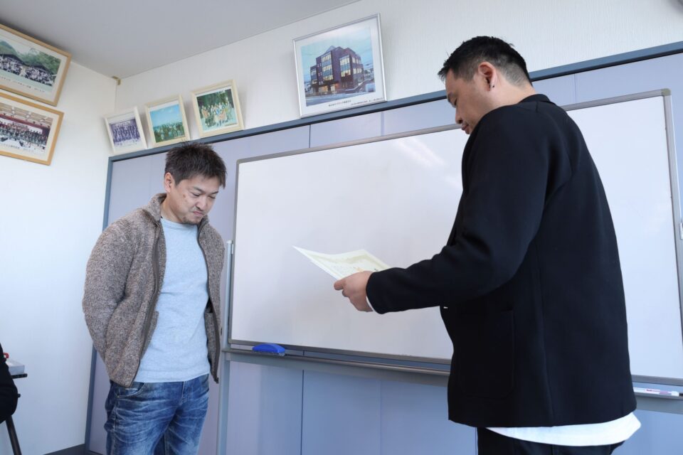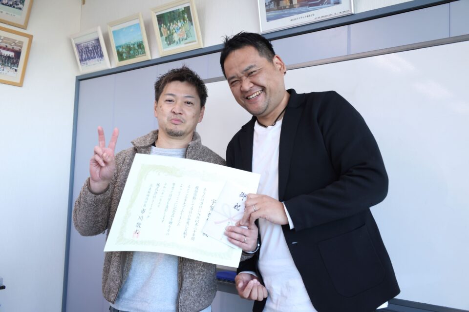 そして、今年は20年永続勤務の2名の表彰式を執り行いました。一人目は開発部次長のUさん、開発部を一緒に取りまとめてくれています。